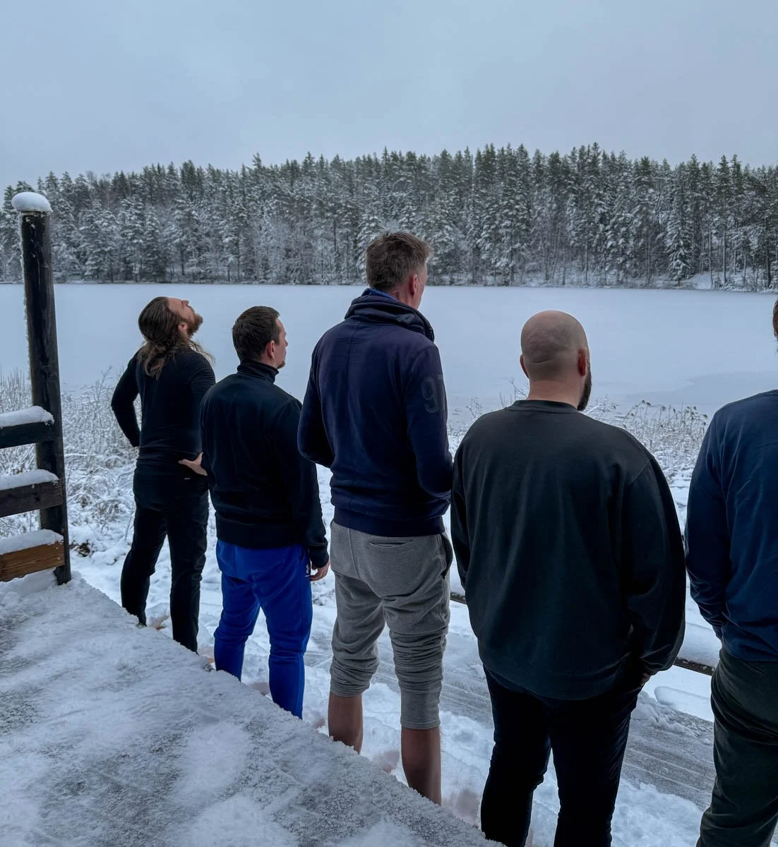 The group of men at our Sweden retreat doing a cold immersion in the lake